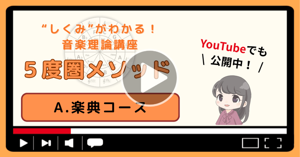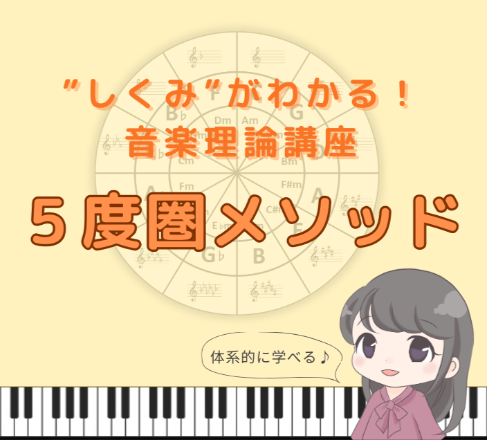 音名からコードの機能まで、音楽用語を中心とした楽典知識を体系的に学びます。5度圏メソッドを終えた後も、スムーズに次の学習(ポップス理論/テンション/ヴォイシングなど)へ繋げることができるよう、主要な用語は英語で解説しています。